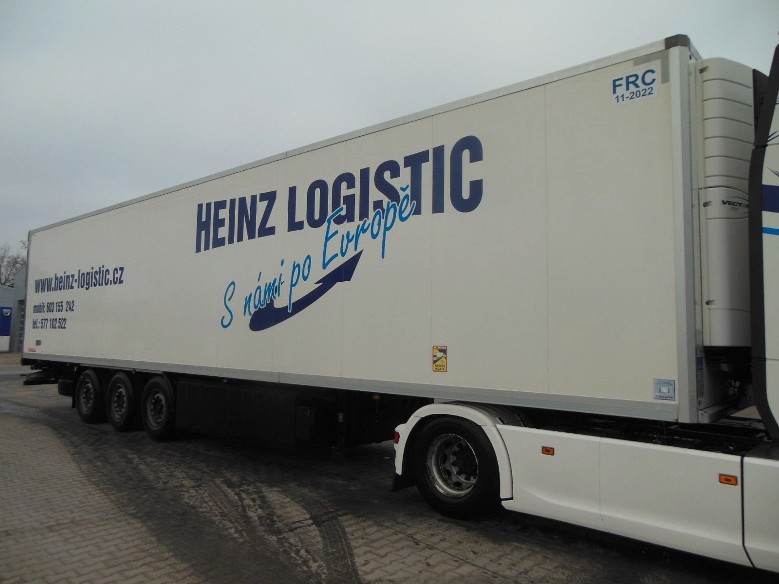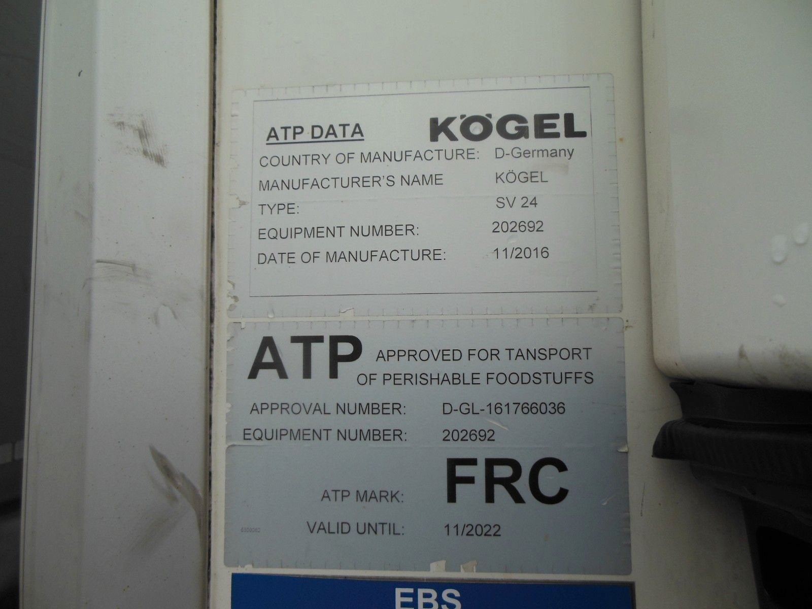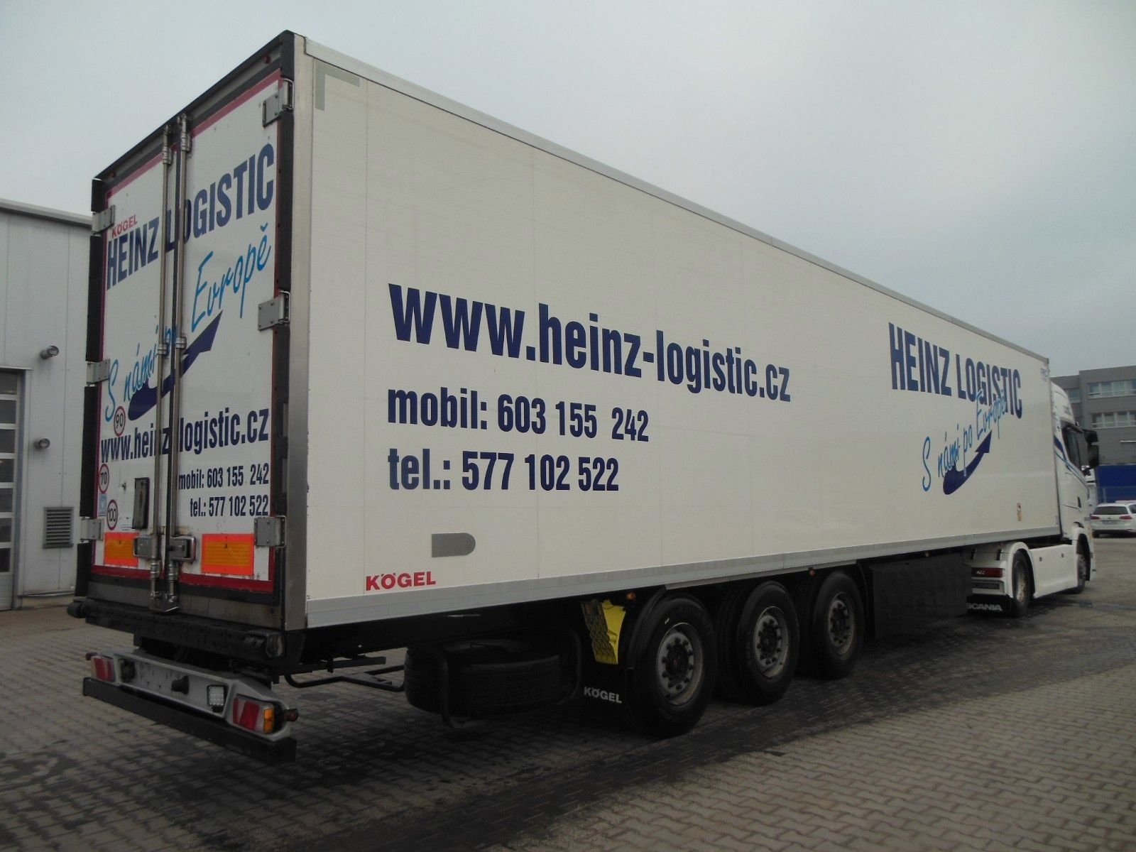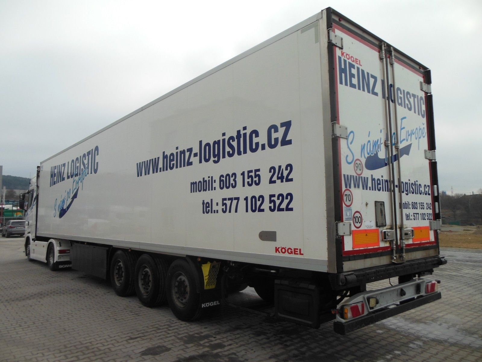 Chladicí návěs Kögel SVT 24, provoz od 12/2016, zvedací náprava, nápravy SAF, chladicí jednotka Carrier Vector 1550 (diesel 6575 h / elektro 1092 h), dvoupodlažní, včetně 22 přepážek, zapisovač teploty, hliníková podlaha, dveře, kotoučové brzdy, ABS. Pneumatiky 385/65 R22 – stav: 1. náprava 5 mm, 2. náprava 6 mm, 3. náprava 7 mm. Ložná plocha: 13 320 × 2470 × 2650 mm. Paletový box, rezerva. Celková hmotnost: 36 000 kg, provozní hmotnost: 8 650 kg.